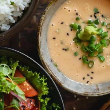 It combines fermented miso paste with fresh ginger and sesame oil to create a balanced sauce that’s bold yet refreshing.